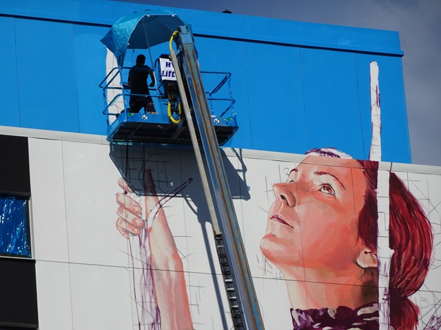 Another mural from the recent No Limit Street Art Festival. This one is on the wall of an hotel, best seen from the Town Park across the river. The artist is Fintan Magee, a muralist based in Sydney, Australia (born 1985).