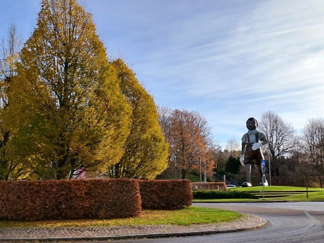 Back down on flat ground, below the park, there is a major busy thoroughfare road to cross; and then a rather complicated traffic roundabout; and in the middle of that, since 2008, stands the huge Pinocchio sculpture by American artist Jim Dine (9 m high, and official title Walking to Borås), which was really the start of our city building a new reputation as a City of Art. (Many more sculptures and murals added since then, and regular art biennials.)